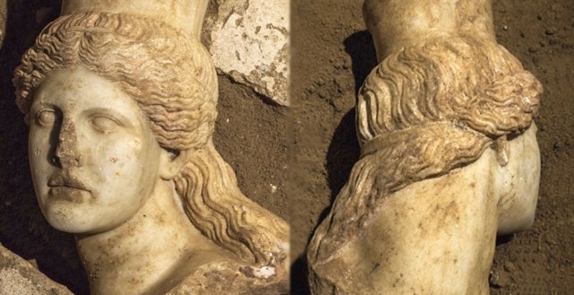 Το μαρμάρινο κεφάλι της Σφίγγας που βρίσκεται στην ανατολική πλευρά της εισόδου του ταφικού μνημείου της Αμφίπολης ανακάλυψαν οι αρχαιολόγοι κατά τη διάρκεια των ανασκαφικών εργασιών στον τύμβο Καστά.