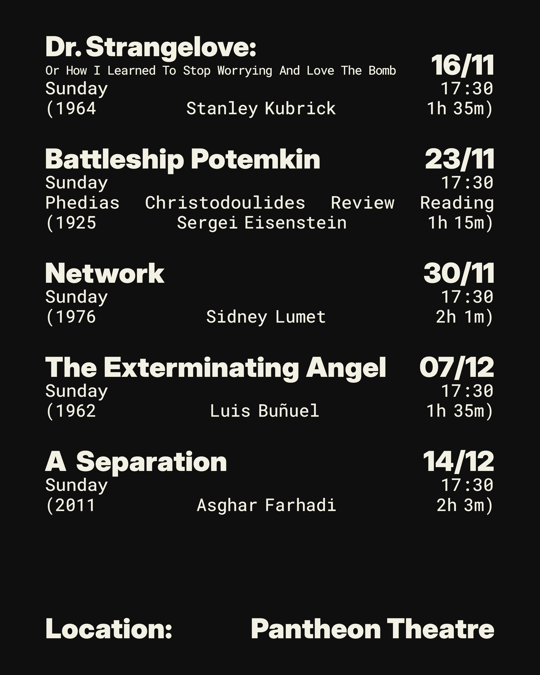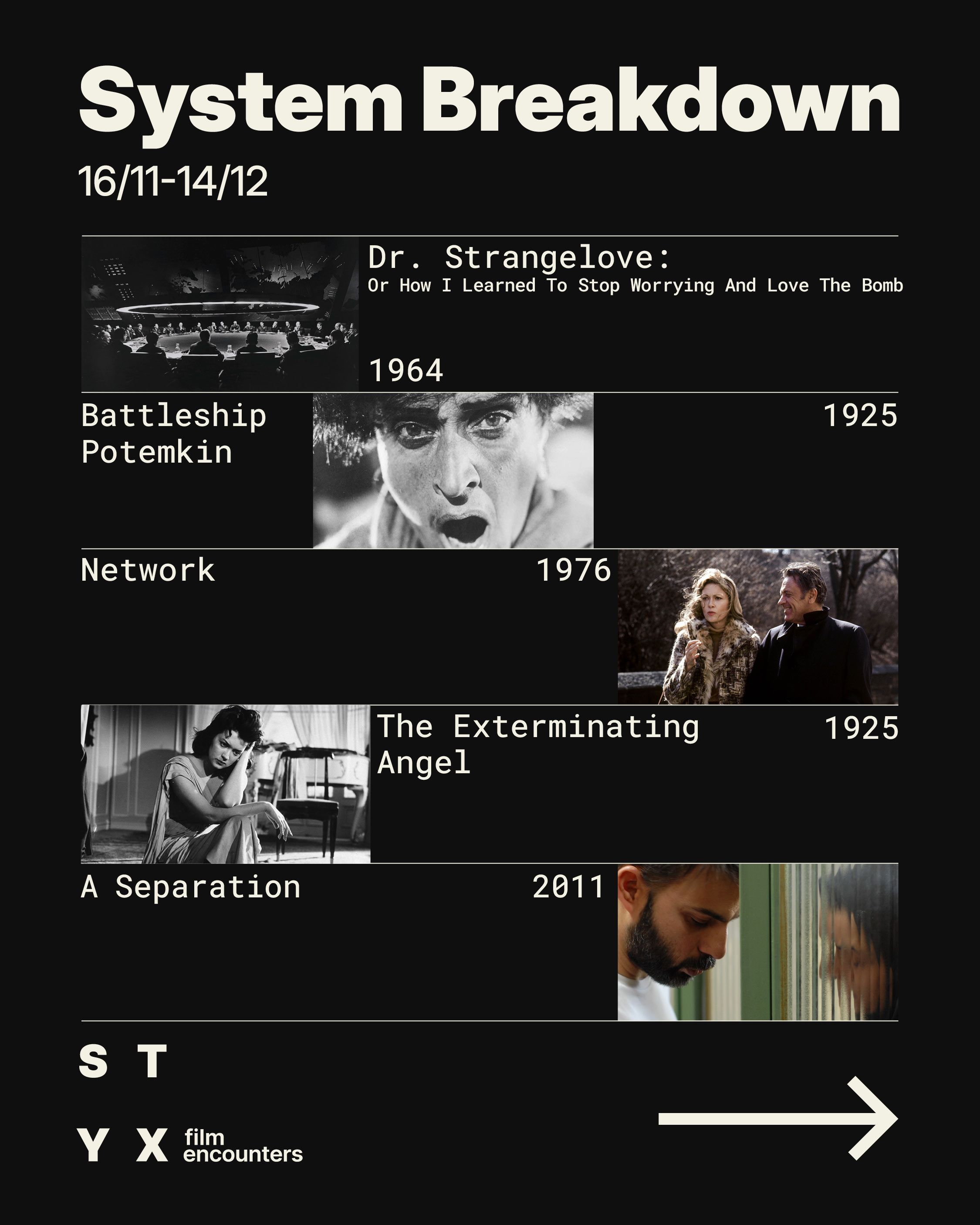Το STYX Film Encounters επιστρέφει τον Νοέμβριο με ένα νέο πρόγραμμα προβολών με τίτλο System Breakdown — μια σειρά από πέντε εμβληματικές ταινίες που διερευνούν τις παραλογίες, τις αποτυχίες και τις κρίσεις των σύγχρονων συστημάτων.