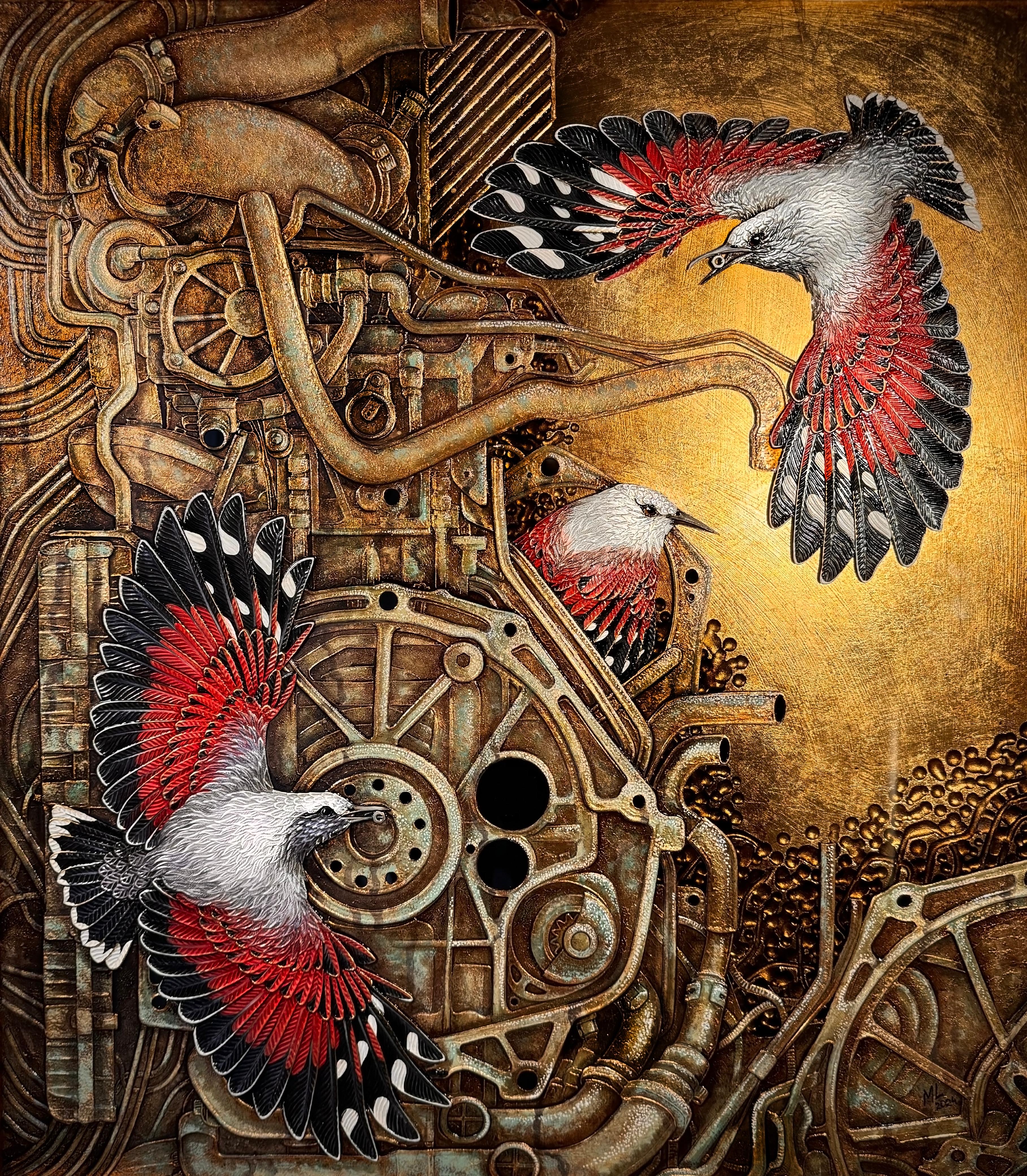 Στα έργα της, το χρυσό, το ακρυλικό και το γυαλί-καθρέφτης συνυφαίνονται δημιουργώντας απτικές οπτασίες γυναικών, μυθικών όντων, πουλιών, αλόγων και ονειρικών μηχανών. Κάθε πίνακας γίνεται ένα τοπίο συναισθήματος — μια σκαλιστή επιφάνεια ζωντανή από αντανάκλαση και λάμψη. Ο καθρέφτης από κάτω λειτουργεί ταυτόχρονα ως πύλη και πέπλο, αντανακλώντας τον θεατή ενώ κρύβει μυστικούς κόσμους κάτω από στρώσεις χρώματος και φωτός.