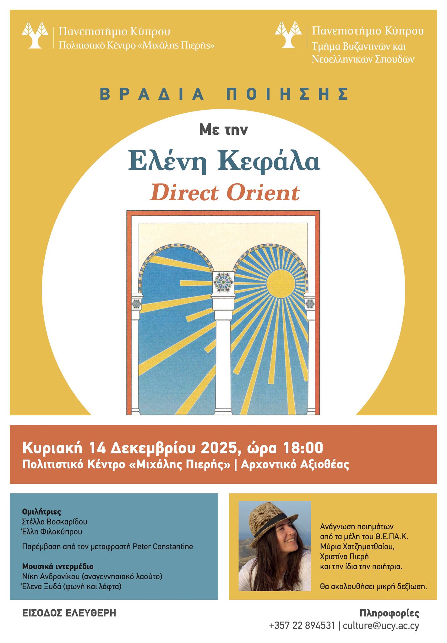 Το Πολιτιστικό Κέντρο «Μιχάλης Πιερής» και το Τμήμα Βυζαντινών και Νεοελληνικών Σπουδών του Πανεπιστημίου Κύπρου διοργανώνουν μία βραδιά αφιερωμένη στην ποιήτρια Ελένη Κεφάλα και στη συλλογή της Direct Orient, η οποία τιμήθηκε φέτος με το Κρατικό Βραβείο Ποίησης της Κυπριακής Δημοκρατίας.