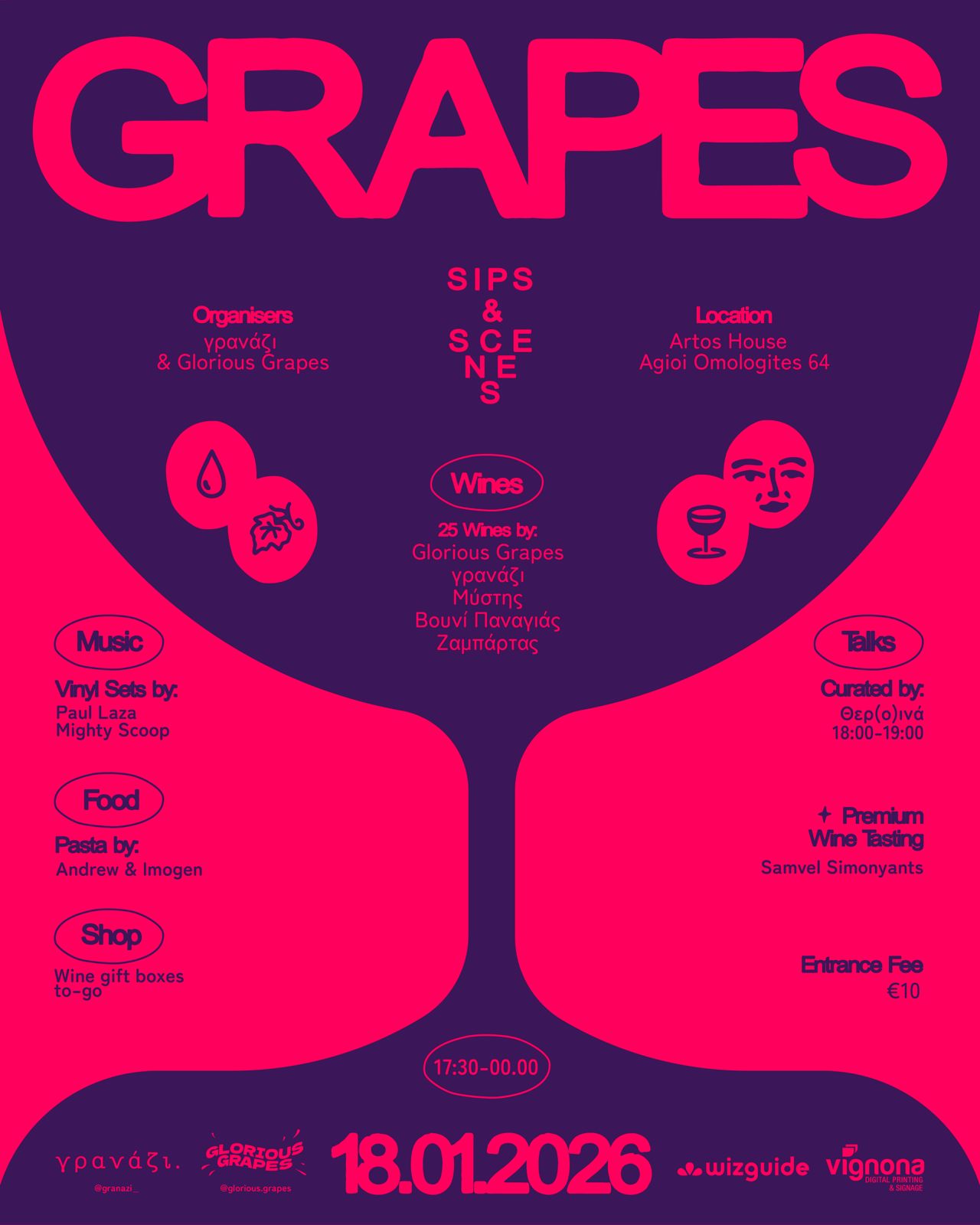 Oι γεύσεις του κρασιού, η μουσική και η γνώση ενώνονται στο «GRAPES / Sips & Scenes», το οποίο λαμβάνει χώρα στις 18 Ιανουαρίου 2025, στο ARTOS House, από τις 17.30 μέχρι και τις 00.00.