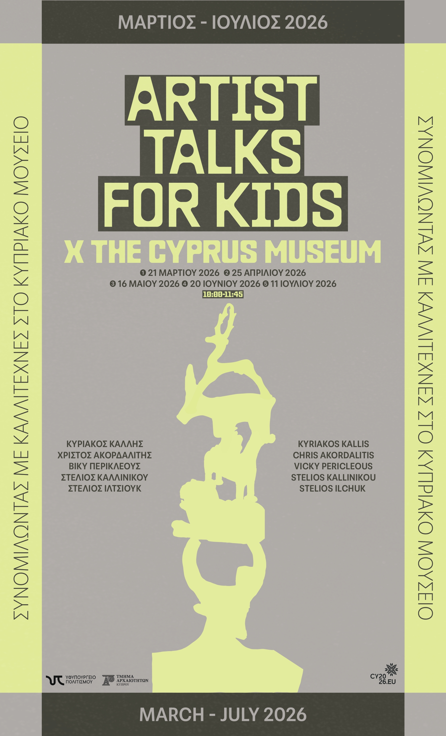Το Τμήμα Αρχαιοτήτων του Υφυπουργείου Πολιτισμού ανακοινώνει την έναρξη της σειράς διαδραστικών δράσεων «Συνομιλώντας με καλλιτέχνες στο Κυπριακό Μουσείο / Artist Talks for Kids x The Cyprus Museum», ενός εικαστικού εκπαιδευτικού προγράμματος για παιδιά ηλικίας 6–12 ετών, το οποίο θα πραγματοποιηθεί από τον Μάρτιο έως τον Ιούλιο 2026.