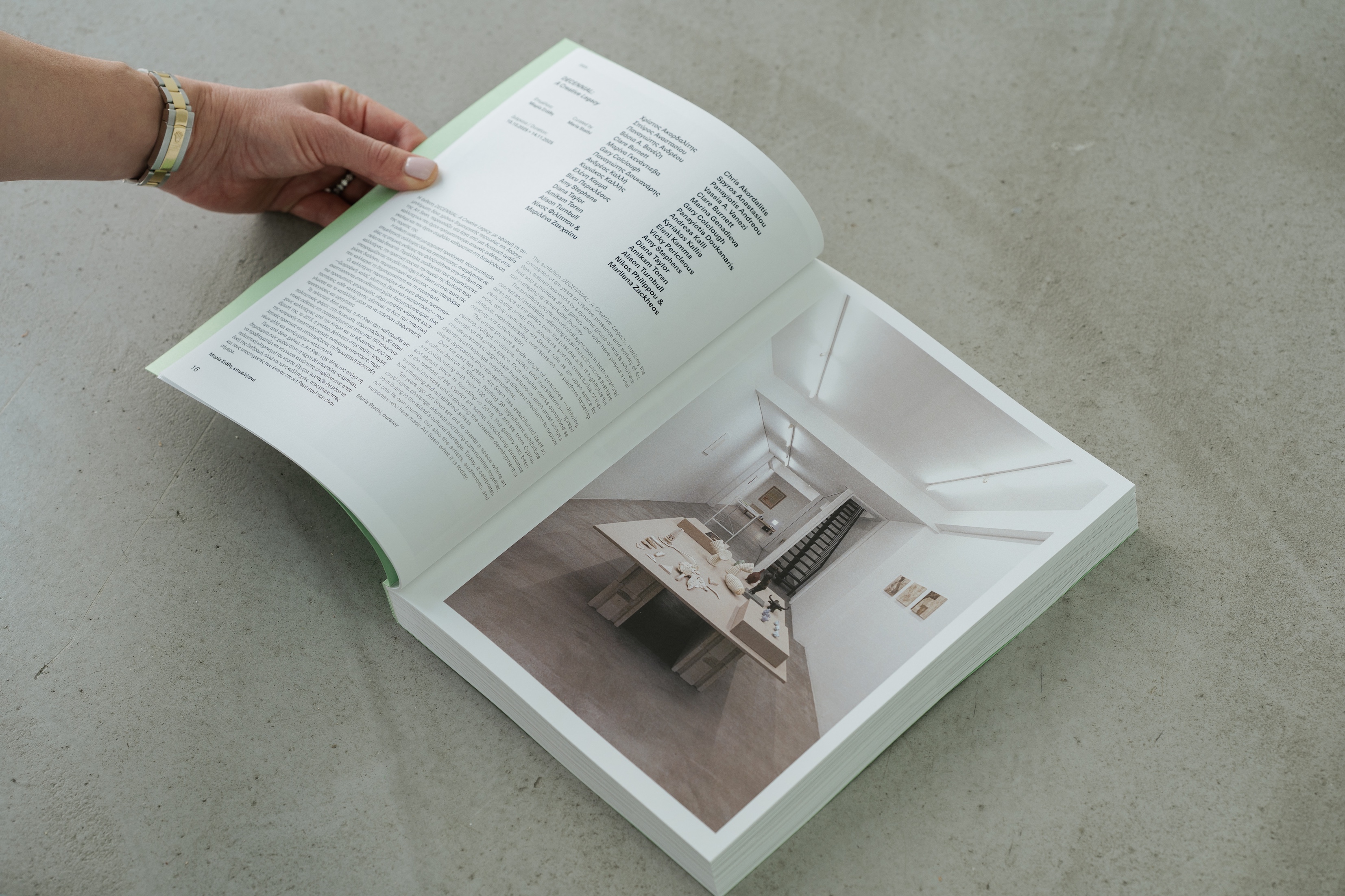 Το Decennial: A Creative Legacy αποτελεί μια έκδοση 304 σελίδων που χαρτογραφεί την επιμελητική πορεία της γκαλερί μέσα από 39 ατομικές και ομαδικές εκθέσεις, παρουσιάζοντας σχεδόν 100 σύγχρονους καλλιτέχνες κατά την τελευταία δεκαετία. Για κάθε έκθεση, ένα ευρύ φάσμα πολιτισμικών παραγωγών —ιστορικοί τέχνης, συγγραφείς, επιμελητές και καλλιτέχνες— συνέβαλαν με ειδικά ανατεθειμένα κείμενα, συγκροτώντας συλλογικά ένα σημαντικό σώμα κριτικού λόγου, τόσο στο τοπικό όσο και στο διεθνές πολιτισμικό πλαίσιο.Η έκδοση αναδεικνύει τη σημασία της κριτικής θεωρίας της τέχνης και της πολιτισμικής πρακτικής, δίνοντας ιδιαίτερη έμφαση στις μεθοδολογίες και τα εννοιολογικά σχήματα που διαμορφώνουν το επιμελητικό όραμα και το πρόγραμμα της Art Seen. Παράλληλα, υπογραμμίζει τη σημασία της καλλιέργειας ενός ισχυρού τοπικού πολιτισμικού οικοσυστήματος, το οποίο περιλαμβάνει πρακτικές οργάνωσης εκθέσεων, καλλιτεχνικής παραγωγής, εκδοτικής δραστηριότητας και αρχειακής τεκμηρίωσης, όπως αυτές αναπτύσσονται από καλλιτέχνες και θεωρητικούς.