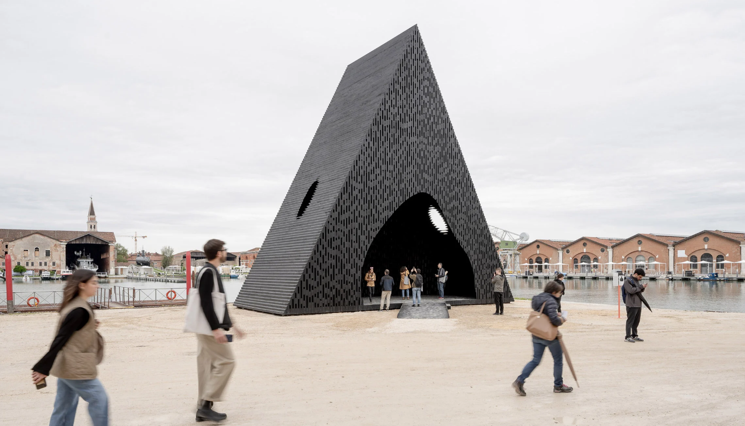 Το αρχιτεκτονικό γραφείο του Αφρικανο-Βρετανού αρχιτέκτονα Ντέιβιντ Ατζαγιέ, Adjaye Associates, από την Γκάνα εκθέτει μια κατασκευή από ξύλο στον εξωτερικό χώρο Ταρσανά του Αρσενάλε.