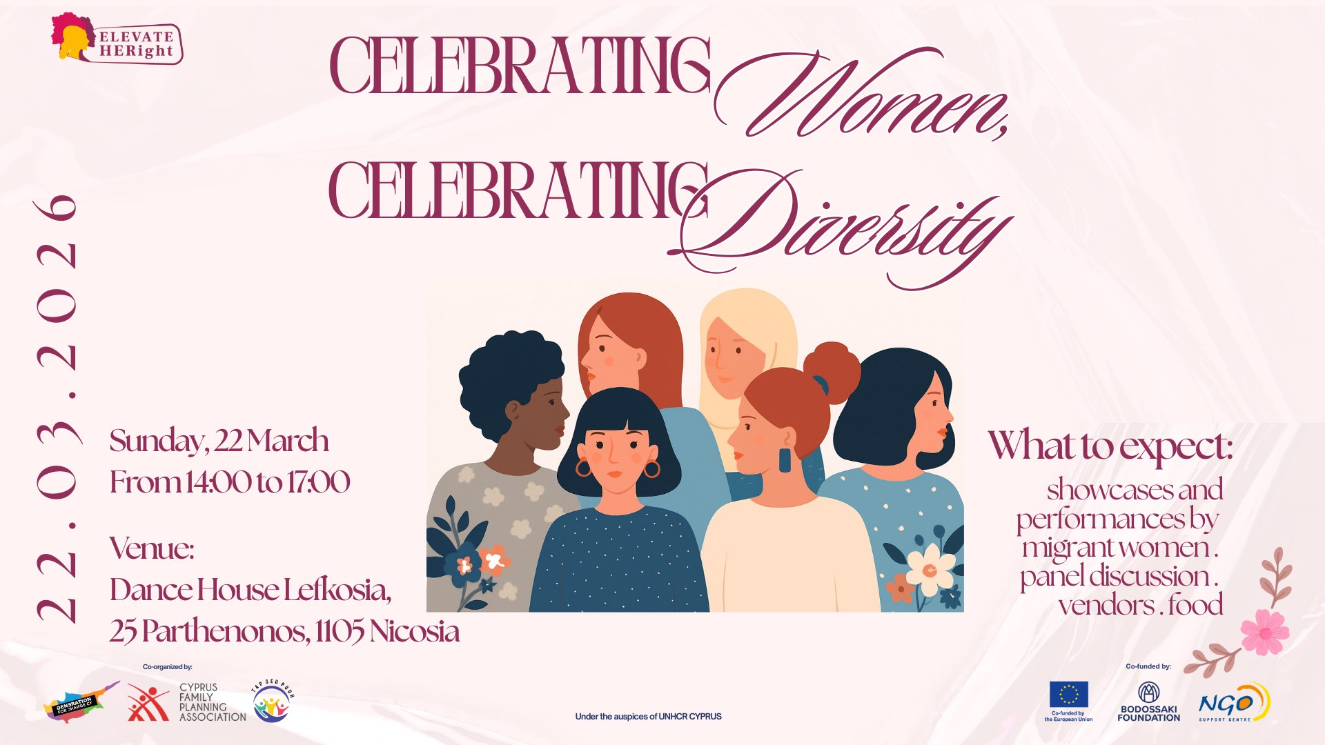 Η εκδήλωση «Celebrating Women, Celebrating Diversity» διοργανώνεται στο πλαίσιο του προγράμματος ELEVATE HERight, μιας πρωτοβουλίας που χρηματοδοτείται από την ΕΕ και υλοποιείται από την οργάνωση Generation for Change CY σε συνεργασία με τον Κυπριακό Σύλλογο Οικογενειακού Προγραμματισμού. Το πρόγραμμα εστιάζει στην πρόληψη και την αντιμετώπιση της έμφυλης βίας κατά των μεταναστριών και των προσφυγών μέσω της ενδυνάμωσης, της ευαισθητοποίησης, της βελτίωσης της πρόσβασης σε βασικές υπηρεσίες υποστήριξης και της ενίσχυσης του κοινοτικού πνεύματος.