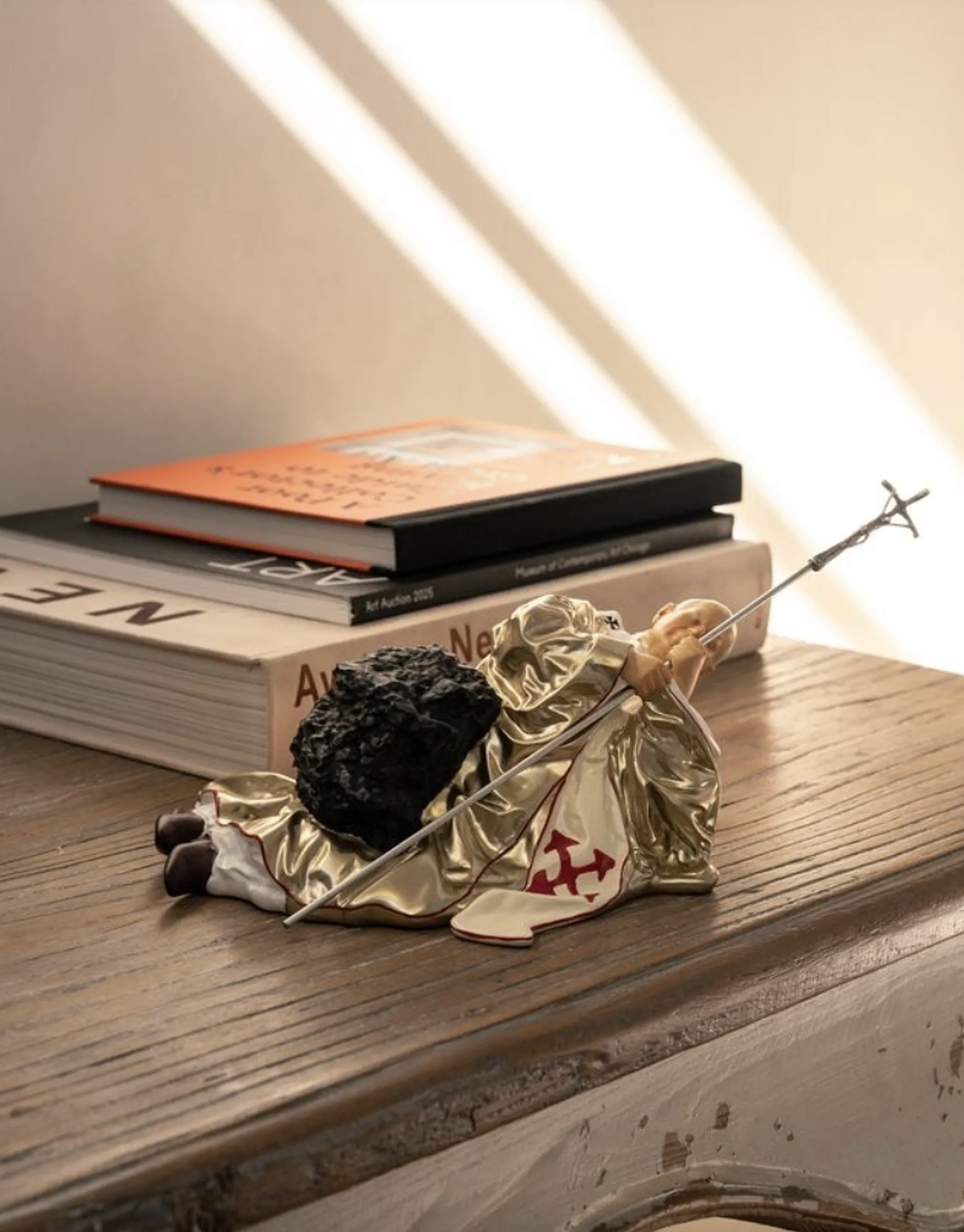 Έχοντας προκαλέσει σάλο το 1999 με το γλυπτό του La Nona Ora («Η Ένατη Ώρα») – μια ρεαλιστική απεικόνιση του Πάπα Ιωάννη Παύλου Β’ την ώρα που χτυπιέται από μετεωρίτη – ο Κατελάν επαναφέρει τον «πεσμένο» ποντίφικα. Αυτή τη φορά, με αφορμή την 21η επέτειο του θανάτου του.