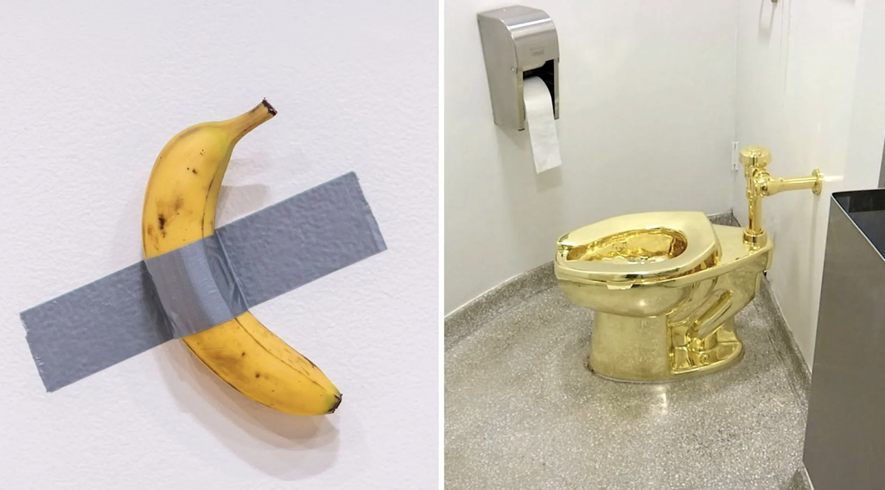 Βέβαια, η πρόκληση δεν υπήρξε ποτέ πρόβλημα για τον Κατελάν. Συχνά χαρακτηρίζεται ως ο «πλακατζής» του κόσμου της τέχνης και είναι γνωστός για το ότι προκαλεί αντιδράσεις και συζητήσεις: είτε με το La Nona Ora το 1999, είτε το 2019 με το έργο Comedian – μια μπανάνα κολλημένη στον τοίχο με ταινία (που πουλήθηκε το 2024 στη Sotheby’s Νέας Υόρκης για €5,8 εκατ.), είτε πέρσι, όταν το λειτουργικό, χρυσό (18 καρατίων) γλυπτό-τουαλέτα του πωλήθηκε για 12,1 εκατομμύρια δολάρια.