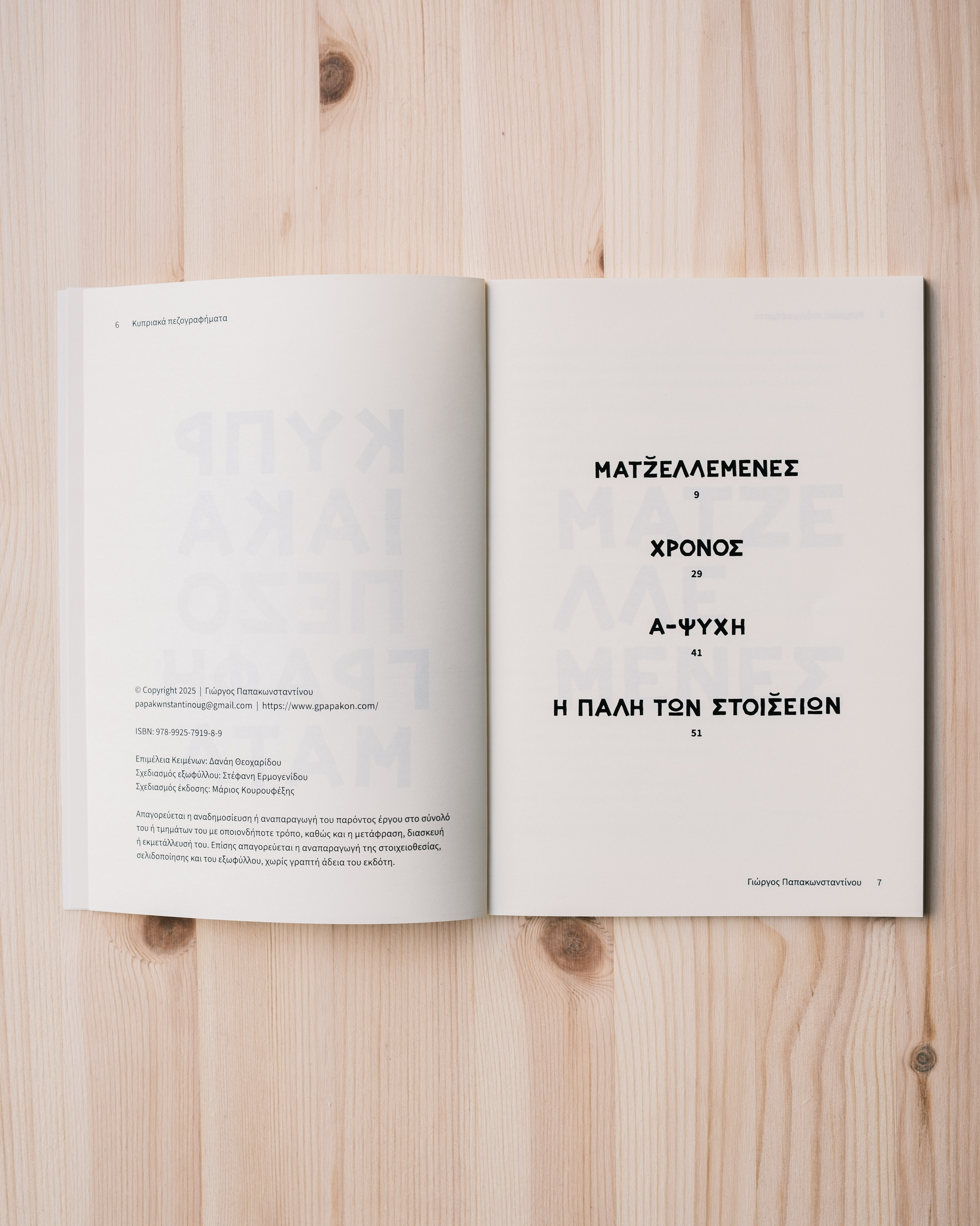 Η συλλογή κυκλοφόρησε το 2025 σε αυτοέκδοση (ISBN: 978-9925-7919-8-9) και εκτείνεται σε 62 σελίδες. Περιλαμβάνει τέσσερα πεζογραφήματα σε θεατρική συνθήκη: «Ματζ̆ελλεμένες», «Χρόνος», «Α-Ψυχή» και «Η πάλη των στοισ̆ειών»  εξερευνούν διαφορετικές ανθρώπινες εμπειρίες και σύγχρονους κοινωνικούς προβληματισμούς. Κάθε κείμενο προσεγγίζει ένα διακριτό πεδίο σύγκρουσης, προσωπικό ή συλλογικό, συγκροτώντας ένα ενιαίο δραματουργικό σύνολο.