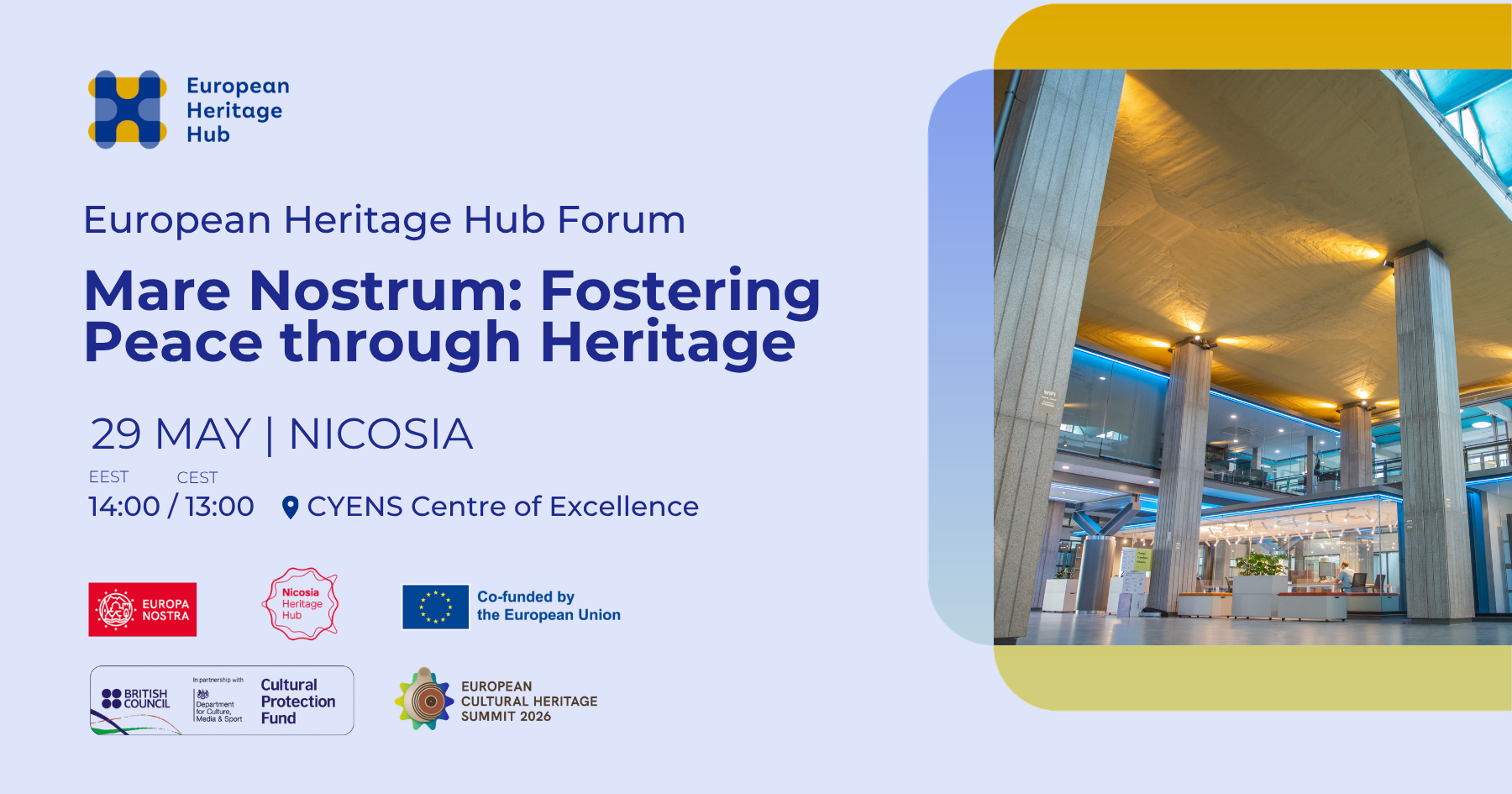 Το Forum, με τίτλο «Mare Nostrum: Fostering Peace through Heritage», εντάσσεται στο πλαίσιο της ευρωπαϊκής πρωτοβουλίας European Heritage Hub και διοργανώνεται από την Europa Nostra, σε συνεργασία με το τοπικό Hub στη Λευκωσία, με τη συμβολή διεθνών πολιτιστικών φορέων και τη στήριξη του Cultural Protection Fund του British Council.