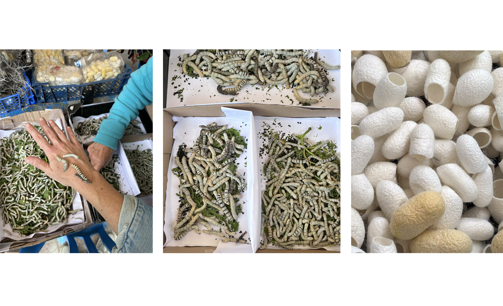 Καθώς τοποθετεί στο χέρι μου διαφορετικά είδη μεταξοσκώληκα, περιγράφει τον κύκλο της ζωής τους. Μια διαδικασία ταυτόχρονα ποιητική και, με έναν τρόπο, μελαγχολική. Ο κύκλος ζωής του μεταξοσκώληκα διαρκεί περίπου 60 ημέρες. Στο στάδιο του σκουληκιού, που κρατά γύρω στις 40 μέρες, περνά από τέσσερις «ύπνους». Μετά από κάθε έναν από τους τρεις πρώτους, ξυπνά και αλλάζει δέρμα. Στον τέταρτο ύπνο αλλάζει χρώμα, γίνεται πιο διάφανος, καθαρίζει το σώμα του και αρχίζει να αναζητά σημείο για να φτιάξει το κουκούλι του.