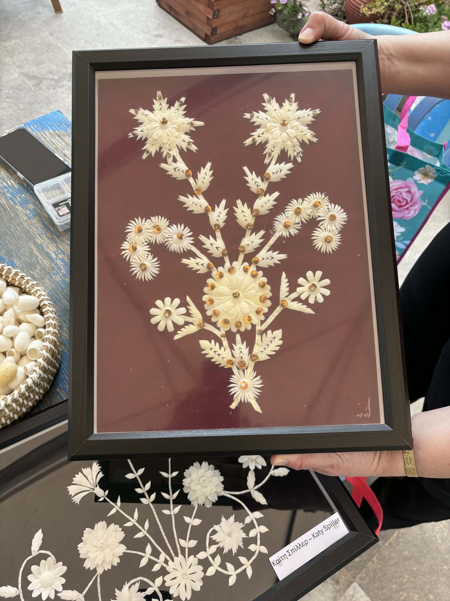«Το φεστιβάλ ήταν το κοινό μας όνειρο», λέει η Καίτη καθώς απλώνει σε ένα τραπέζι κάδρα με κουκούλια σε περίπλοκα σχήματα λουλουδιών που δημιούργησε η ίδια. «Το πρώτο φεστιβάλ έγινε πέρσι με τη βοήθεια του κοινοτικού συμβουλίου Καλαβασού. Είχε μεγάλη επιτυχία, έγινε χωρίς καμία χορηγία και βοήθεια. Σκοπός της ομάδας «Το Καματερόν» είναι να ξαναζωντανέψουμε τη σηροτροφία, μια τέχνη που είχε κάποτε ανθήσει στην Κύπρο. Ιδιαίτερα την τέχνη δημιουργίας κάδρων με κουκούλια, όπου πάνω σε βελούδο οι γυναίκες κεντούσαν τα κουκούλια συνήθως σε σχέδια εμπνευσμένα από τη φύση.