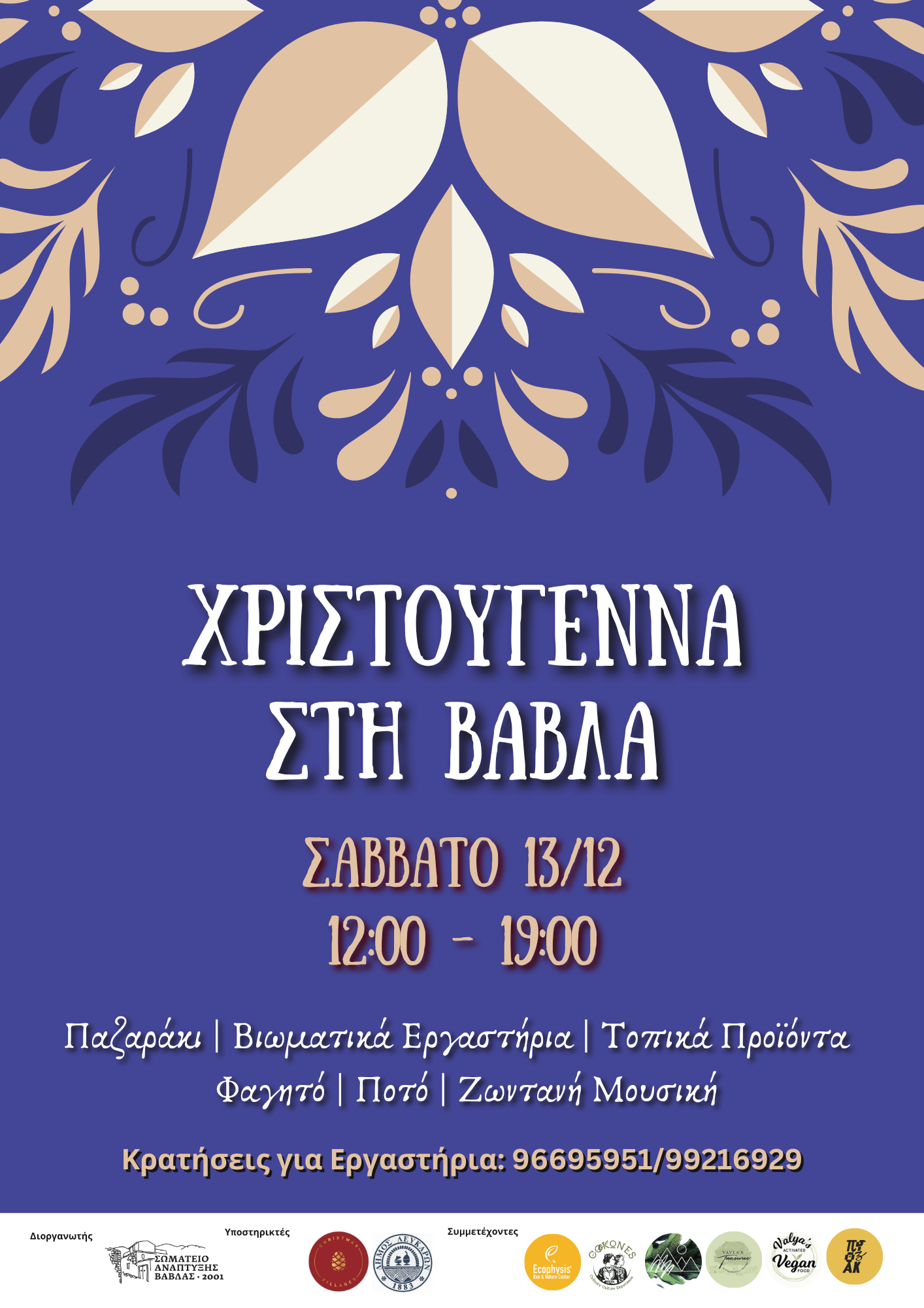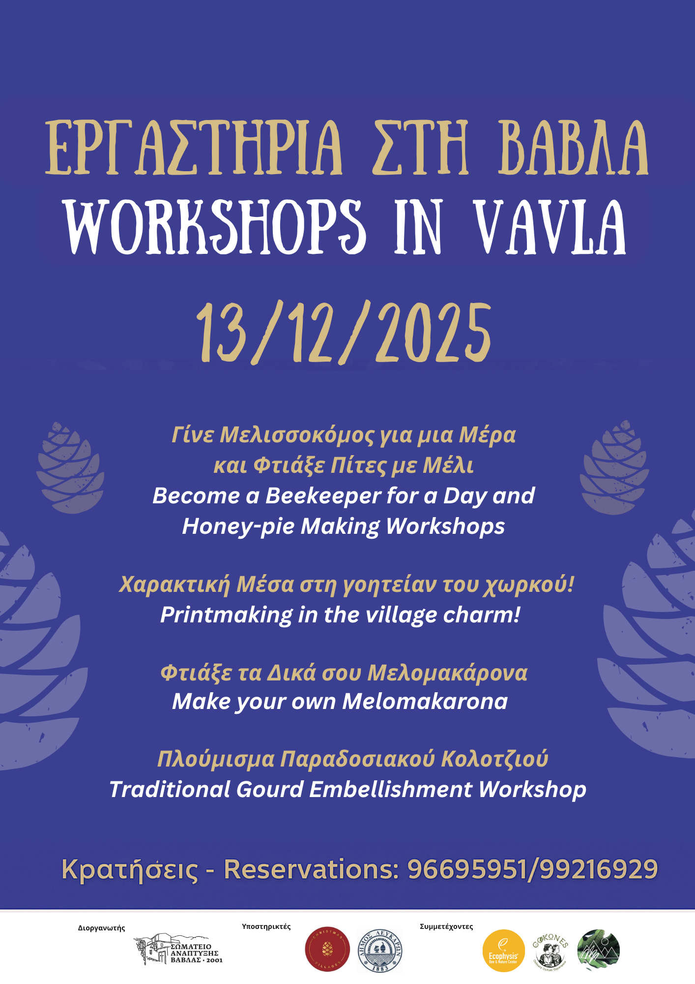 Οι επισκέπτες που επιθυμούν να συμμετάσχουν σε κάποιο εργαστήριο παρακαλούνται να κρατήσουν τη θέση τους εκ των προτέρων.Ελάτε να μοιραστούμε μαζί τη μαγεία των Χριστουγέννων στη Βάβλα και να γιορτάσουμε την ομορφιά της τοπικής παράδοσης.