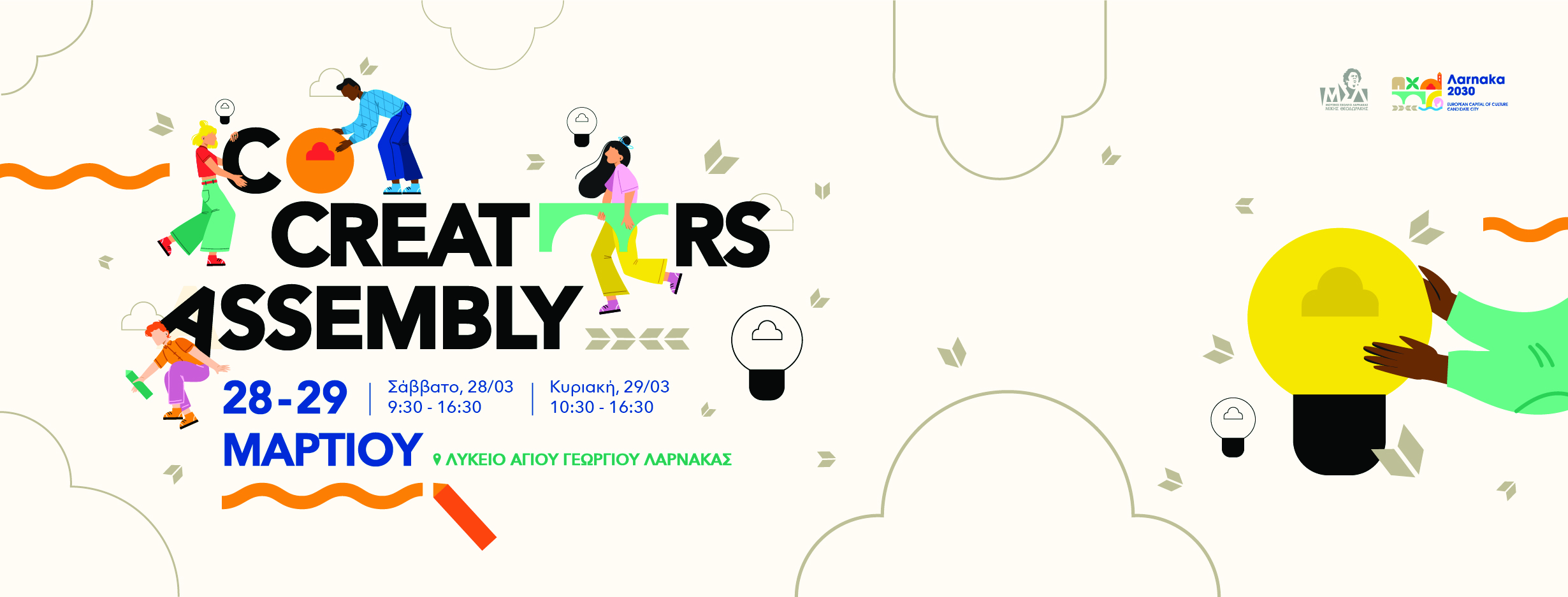 Το Λάρνακα 2030, σε συνεργασία με το Μουσικό Σχολείο Λάρνακας «Μίκης Θεοδωράκης», με χαρά ανακοινώνει τη μεγάλη συνάντηση των συνδημιουργών του. Το Σαββατοκύριακο 28 και 29 Μαρτίου 2026, στο Λύκειο Αγίου Γεωργίου στη Λάρνακα, θα πραγματοποιηθεί η ετήσια Συνέλευση Συνδημιουργών, Co-Creators Assembly, ένα διήμερο συνέδριο αφιερωμένο στην παρουσίαση, κατανόηση και τον εμπλουτισμό του Καλλιτεχνικού Προγράμματος της Πολιτιστικής Πρωτεύουσας της Ευρώπης 2030.