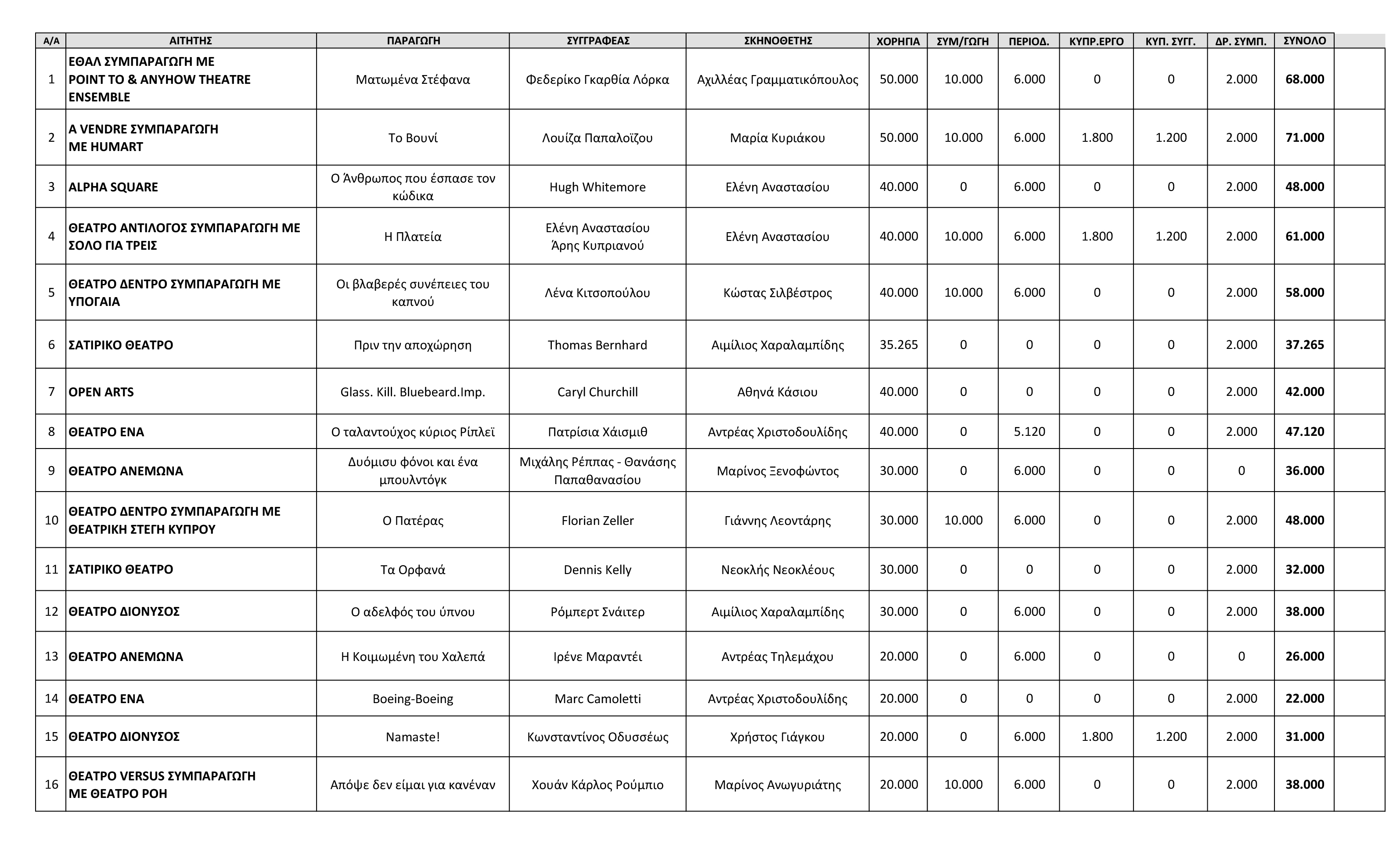 Σε συνέχεια της ανακοίνωσης ημερομηνίας 30.12.2025, αναφορικά με τα αποτελέσματα του Σχεδίου ΘΥΜΕΛΗ για το Α΄ Εξάμηνο του 2026 και σε συνέχεια της αποδοχής και μη αποδοχής των χορηγιών για εγκεκριμένες προτάσεις, το Υφυπουργείο Πολιτισμού δημοσιεύει στον Πίνακα που επισυνάπτεται, τον τελικό κατάλογο με τις δεκαέξι (16) εγκεκριμένες θεατρικές παραγωγές, τις περιοδείες και τα ποσά που θα διατεθούν για την πραγματοποίησή τους κατά το Α’ εξάμηνο του 2026, στο πλαίσιο εφαρμογής του εν λόγω Σχεδίου.