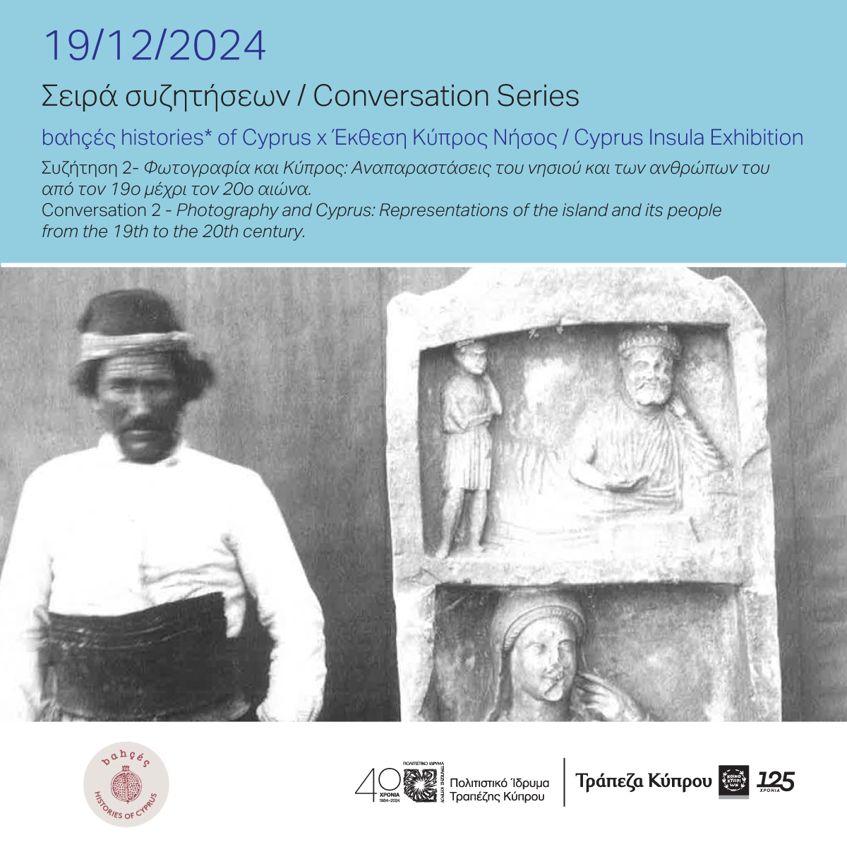 Το Πολιτιστικό Ίδρυμα Τραπέζης Κύπρου και η ομάδα bαhçές histories* of Cyprus σας προσκαλούν στο δεύτερο μέρος της σειράς συζητήσεων γύρω από την περιοδική έκθεση «Κύπρος Νήσος», με τίτλο Φωτογραφία και Κύπρος: Αναπαραστάσεις του νησιού και των ανθρώπων του από τον 19o μέχρι τον 20o αιώνα. Η συζήτηση θα πραγματοποιηθεί την Πέμπτη 19/12/2024 στο χώρο του Ιδρύματος.
