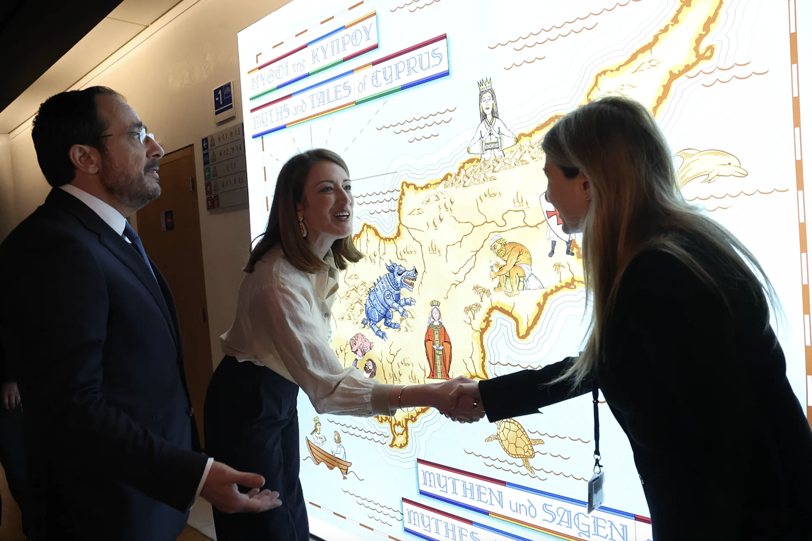 Οι οκτώ μύθοι της Κύπρου: Οι Δράκοι, Το Κρασί των Ιπποτών, Οι πέτρες του Διγενή, Η Αγία Ελένη και ο Τίμιος Σταυρός, η Σιερόλοττα, ο Κατακλυσμός, ο Άδωνις και Τα κάστρα της Ρήγαινας κοσμούν από σήμερα το κτήριο του Ευρωπαϊκού Κοινοβουλίου, στο Στρασβούργο, στο πλαίσιο έκθεσης του ΓΤΠ «Οι Μύθοι της Κύπρου», την οποία εγκαινίασε ο Πρόεδρος της Δημοκρατίας Νίκος Χριστοδουλίδης στην παρουσία της Προέδρου του Ευρωπαϊκού Κοινοβουλίου Ρομπέρτα Μέτσολα.
